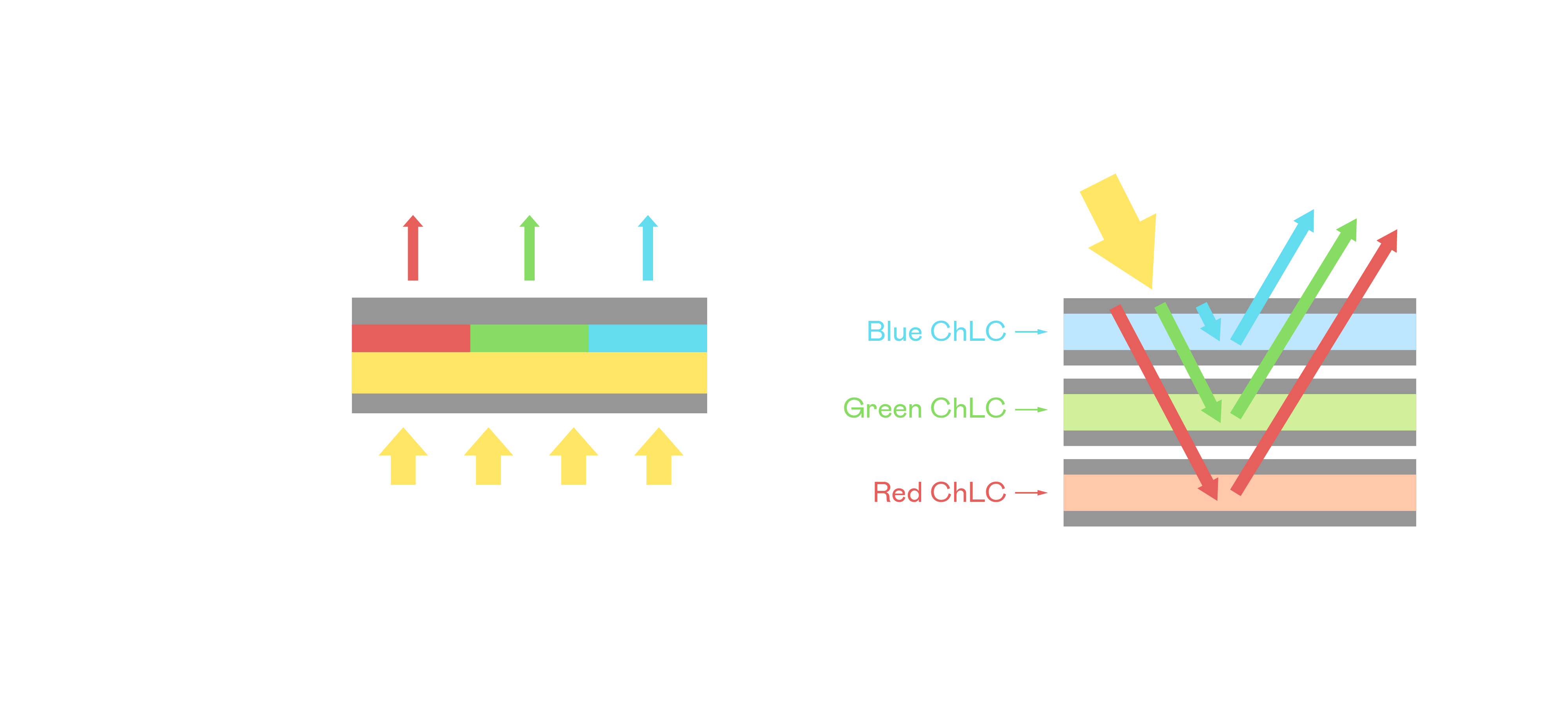 糖心vogo入口胆固醇液晶显示器是由红、绿、蓝三层胆固醇液晶面板堆叠而成,并采用无彩色滤光片设计,减少环境光在反射过程中的损耗。